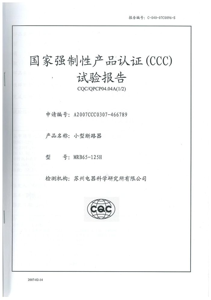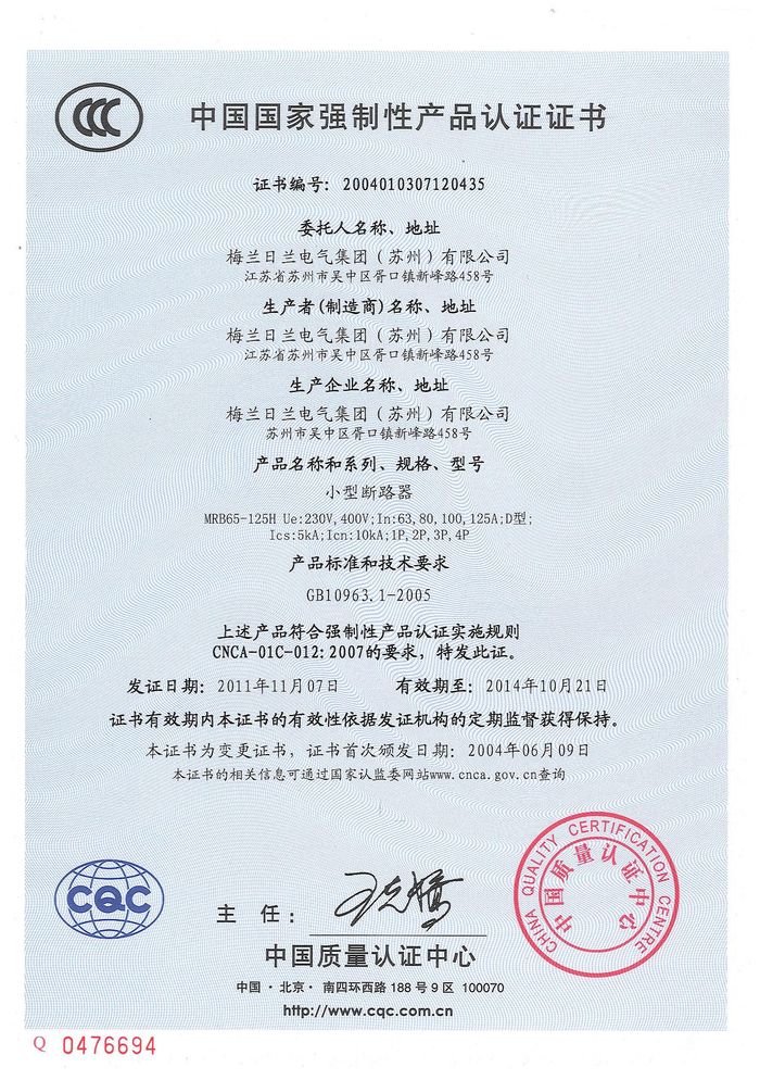 MRB65-125H小型斷路器資質(zhì)證書(shū)