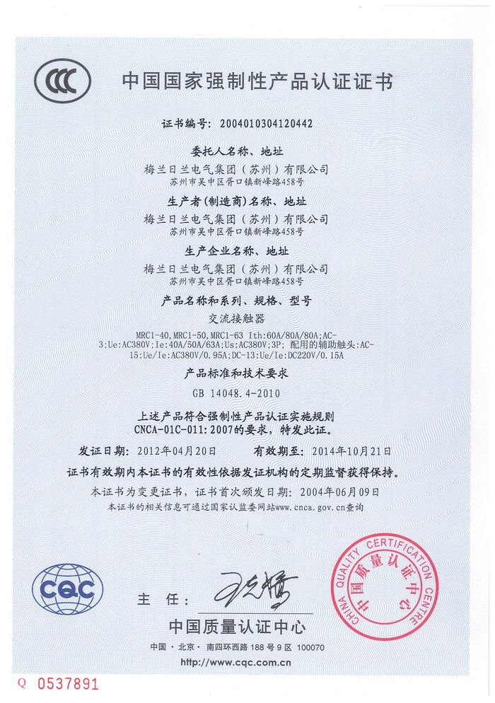 MRC1-40交流資質(zhì)證書(shū)