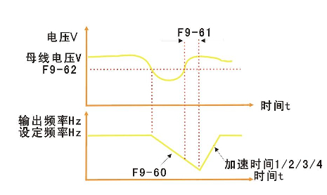 此功能指在瞬時(shí)停電時(shí)變頻器不會停機(jī),在瞬間停電或電壓突然降低的情況下,變頻器降低輸出速度,通過負(fù)載回饋能量,補(bǔ)償電壓的降低,以維持變頻器短時(shí)間內(nèi)繼續(xù)運(yùn)行。